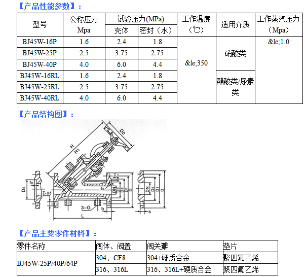 【BJ45直流式保溫截止閥】是根據Y型截止閥兩法蘭之間焊裝夾套,閥門的側面、底部設置有保溫夾套的兩個連接口,用于注入蒸汽或其它保溫、保冷介質,確保閥內介質能夠正常工作。具有良好的保溫保冷特性,同時又能有效降低管路中介質熱量損失。保溫夾套截止閥采用整體式夾套結構設計,更能均勻地保溫、保冷,夾套采用碳素鋼管焊接比鑄造的更加耐壓牢固。 夾套、閥體外側與夾套接管焊接,允許蒸汽或冷水的最高壓力為1MPa 。 【產品特點及用途】: 【BJ45直流式保溫截止閥】的保溫夾套焊裝于閥門的兩法蘭之間,特別適用于化工、化肥行業的管路上,夾套內涵入蒸汽能防止介質結晶。直流式保溫截止閥廣泛應用于石油、化工、冶金、制藥等各類系統中,以輸送常溫下會凝固的高粘度介質。 產品特點: 1、密封面硬化處理以抗磨損。 2、閥頸軸襯材料具有低摩擦系數,大大地降低扭力和軸面磨損,以及消除表面擦傷。 3、閥中腔裝置是由兩件組成,利于快速拆裝及在原地做內部修理。 4、傾斜軸的構造和最佳流道的形狀、減低流向之變換和減少降壓數。 5、閥座之整體表面硬化:提供確實的關閉和閥座之長久使用壽命。 6、螺紋蓋:防止卡死和易于裝拆。 7、閥軸填墊裝置:利用滲有碳纖維裂隙的圓環之柔軟石墨做填料,以l 作最佳之防漏和經久耐用。 8、往復試驗10000次無故障,性能可靠防止外泄漏。