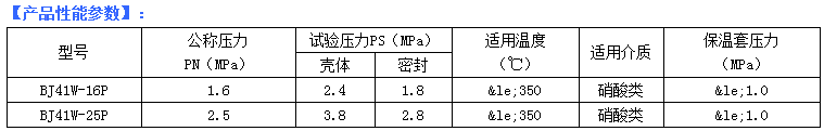 【BJ41保溫截止閥】開閉過程中密封面之間摩擦力小,比較耐用,開啟高度不大,制造容易,維修方便,不僅適用于中低壓,而且適用于高壓。它的閉合原理是,依靠閥杠壓力,使閥瓣密封面與閥座密封面緊密貼合,阻止介質流通。 【產品特點、用途】:     【BJ41保溫截止閥】特別適用于化工、化肥行業的管路上,夾套內涵入蒸汽能防止介質結晶。保溫截止閥被廣泛應用于石油、化工、冶金、制藥等各類系統中,以輸送常溫下會凝固的高粘度介質。保溫截止閥只許介質單向流動,安裝時有方向性。它的結構長度大于閘閥,同時流體阻力大,長期運行時,密封可靠性不強。 產品優點: 1、結構簡單,制造和維修比較方便。 2、工作行程小,啟閉時間短。 3、密封性好,密封面間摩擦力小,壽命較長。 產品優點: 1、流體阻力大,開啟和關閉時所需力較大。 2、不適用于帶顆粒、粘度較大、易結焦的介質。 3、調節性能較差。