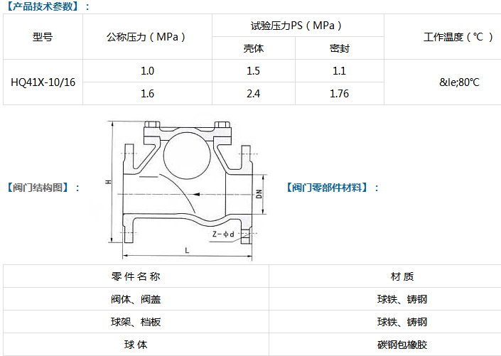 【HQ41X滑道滾球式止回閥】采用橡膠包皮流球為閥瓣在介質(zhì)的作用下可在閥體內(nèi)的整體式滑道上作上下滾動從而開或關(guān)閉閥門密封性能好消聲式關(guān)閉不生水錘。閥體采用全水流通道流量大.阻力小.水頭損失比旋啟式小50%,水平或垂直安裝均可,可用于冷水、熱水、工業(yè)及生活污水管網(wǎng)更適合潛水排污泵介質(zhì)溫度為0-80℃,可安裝于水泵出水口處,以防止倒流及水錘對泵損害。 【閥門特點】: 1、閥瓣關(guān)閉快速,水錘壓力小 2、水平或垂直管道均可使用,安裝方便 3、流道通暢、流體阻力小 4、動作靈敏、密封性能好 5、閥瓣行程短、關(guān)閥沖擊力小 6、整體結(jié)構(gòu)、簡單緊湊、造型美觀 7、使用壽命長、可靠性高 【產(chǎn)品技術(shù)參數(shù)】: 型號 公稱壓力(M