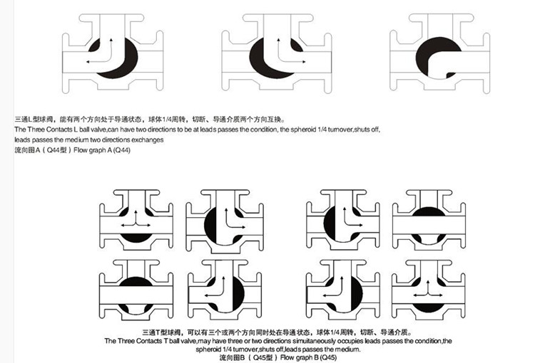 T形三通球閥 產(chǎn)品名稱:三通球閥 產(chǎn)品型號:Q45F 產(chǎn)品規(guī)格:DN15-200 產(chǎn)品壓力:0.1~1.6Mpa 適用溫度:-10℃~150℃ 產(chǎn)品材質(zhì):鑄鋼、WCB、WC6、鍛鋼、A105、不銹鋼、304、316。 連接方式:法 蘭。 適用介質(zhì):水。蒸汽、油品、硝酸 驅(qū)動方式:手動、氣動、液動、電動、蝸輪。 三通球閥有T型和L型。T型能使三條正交的管道相互聯(lián)通和切斷第三條通道,起分流、合流作用。L型只能連接相互正交的兩條管道,不能同時保持第三條管道的相互連通,只起分配作用。 產(chǎn)品特點